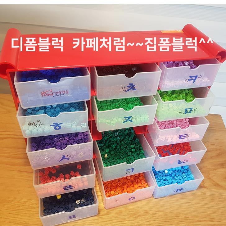 이렇게 마지막까지 완벽하게 집폼 블록 카페 연출해 보았네요. 한글 공부 때 사용하던 몬테소리 글자공부 정리함을 비우고 이렇게 디폼 블럭으로 체워 넣었더니 딱이네요. 보통 색상이 30여 종류는 되는 것 같아요. 나머지 색상들은 락앤락애 보관 하였습니다. 화이트나 블랙색상처럼 많이 사용하게 되는 색상은 별도로 큰 통에 보관 해 두니 든든하더라구요.